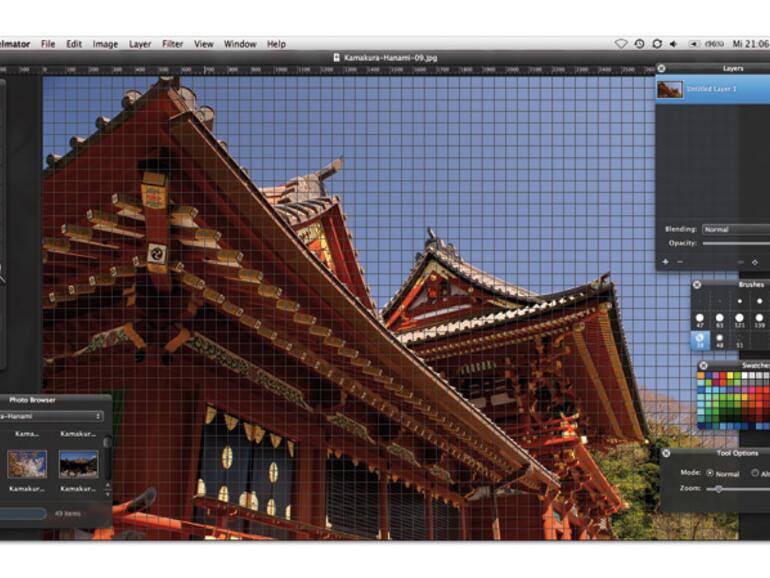Optisch fällt die reduzierte Transparenz der Werkzeugpaletten ins Auge. Nach wie vor lässt sich mit ihnen aber die Arbeitsfläche zubauen – Pixelmator erlaubt nicht, Paletten zusammenzulegen. Die Werkzeugoptionen fallen auch in Version 1.2 sehr knapp aus. Bei den Funktionen ist allerdings einiges hinzugekommen. So lassen sich endlich ein Gitter und Lineal einblenden, um präziser arbeiten zu können. Hilfslinien, die aus dem Lineal herausgezogen werden, können magnetische Eigenschaften besitzen. Die Präzision einiger Werkzeuge hat der Hersteller verbessert.