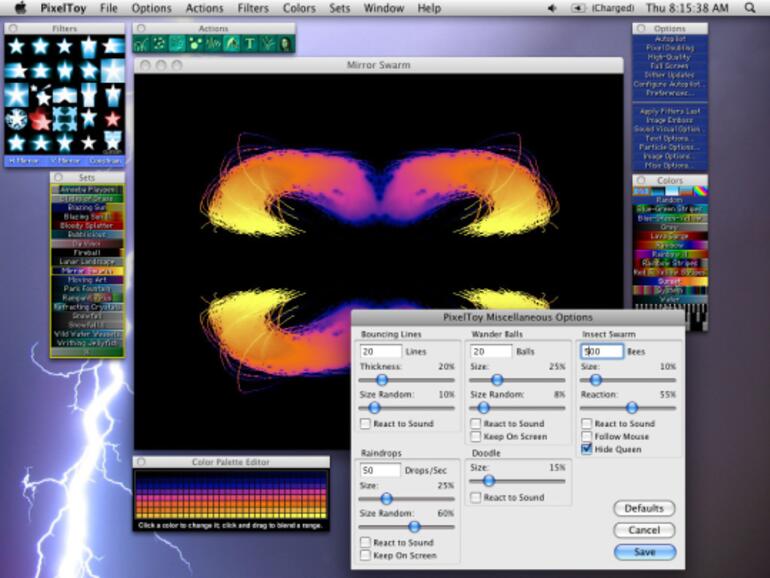 Die Mona Lisa ist aber nur eine von neun Aktionen. Zu denen gehören unter anderem auch Regentropfen und Partikel. Allzu hohe Erwartungen sollte man aber nicht an die Darstellungsqualität haben: Schnee ist in PixelToy ein weißer Punkt, die Partikeleffekte sind bunt, haben aber mit realistischer Darstellung nichts zu tun. Dafür gibt es unzählige Optionen, die sich verändern lassen. Dann ist PixelToy mehr als ein Animationsspielzeug. Ein noch relativ einfaches Beispiel ist die Textfunktion: Text kann pulsieren, auf Sound reagieren und dementsprechend Höhe und Helligkeit variieren. Die Mona Lisa lässt sich natürlich auch durch eigene Grafiken ersetzen. Neben dem Sichern von Bildern kann PixelToy die aktuelle Animation auch als QuickTime-Film exportieren.