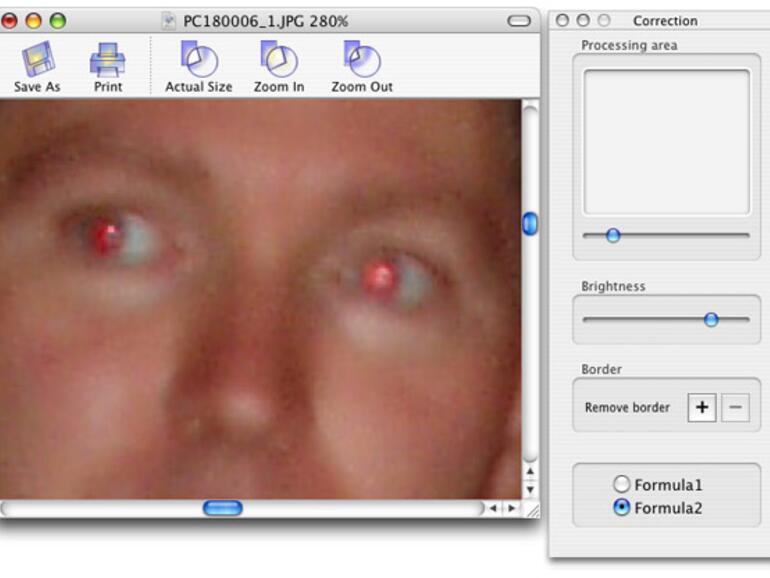 Das Ergebnis ist ein graues Auge, welches zwar immer noch nicht natürlich wirkt, aber eben auch nicht mehr dämonisch. Unter OS X 10.3.9 tat sich allerdings nichts – die Software erkannte die Mausklicks nicht und ließ auch die roten Augen weiter funkeln. Für Tierfotos eignet sich Red Eye Pilot nicht – dafür hat die Herstellerfirma ein separates Produkt im Angebot (Pet Eye Pilot, derzeit nur für Windows).