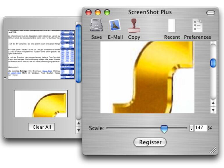 Möglich ist allerdings auch eine Vergrößerung – in beiden Fällen baut sich schnell eine Vorschau auf, in der unregistrierten Version wird jedes Bild mit einem kleinen, halbtransparenten Wasserzeichen versehen. In einer kleinen Seitenleiste merkt sich die Software die zuletzt aufgenommenen Bildschnipsel und kann diese erneut aufrufen. Erwähnenswert sind noch die Einstellungen, in denen das Bildformat (JPEG, Photoshop, PICT, PNG, TARGA, TIFF) festgelegt wird. Aus dem Programm heraus kann das digitale Erinnerungsfoto auch direkt an eine E-Mail angehängt werden.