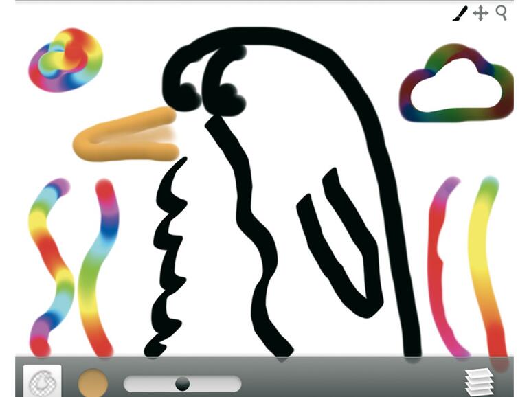Die Bedienung des Programms ist denkbar einfach: Im Fenster gibt es eine Werkzeugleiste mit der Farbauswahl, der Werkzeuggröße und -auswahl sowie dem Ebenenstapel. Insgesamt gibt es neun Malwerkzeuge und drei Radierer, einige der Pinsel orientieren sich an ihren realen Vorbildern, während der Regenbogen-Pinsel vor allem Kindern gefallen dürfte.