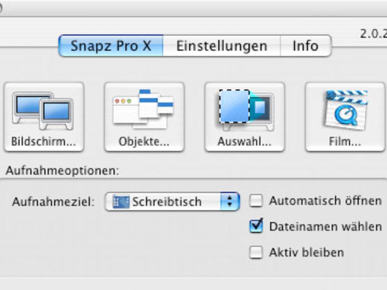 Snapz Pro X 2.0.2 wird von Ambrosia Software in den Versionen „Image Capture“ und „Movie Capture“ angeboten. Mit der „Image-Capture“-Variante für 29 US-Dollar lassen sich Bildschirmfotos in zahlreichen Formaten, wie etwa JPEG, GIF, TIFF und PNG anfertigen. Ist Snapz Pro X einmal gestartet, so lässt sich das Auswahlmenü über die Tastenkombination Apfel+Shift+3 jederzeit aufrufen. Die „Movie-Capture“-Variante des Programms kostet 69 US-Dollar und bietet alle Funktionen zur Anfertigung von Bildschirmfotos. Zusätzlich wird die Möglichkeit gegeben, Videoaufzeichnungen von Bildschirmaktivitäten zu erstellen.