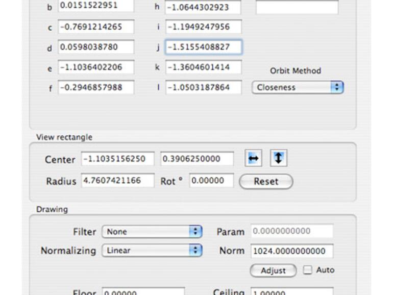 Grundlage zur Berechnung sind einige Zahlen, die vorher eingegeben werden und bei denen schon kleinste Veränderungen dramatische Auswirkungen auf das Aussehen haben können. Zum Glück braucht der Mac mit Synthimax nicht länger als ein paar Sekunden, um zu einem Ergebnis zu kommen. Neben Fraktalen generiert die Software auch verwirbelte Sinus/Cosinus-Gebilde, Feedback-Bilder und einiges mehr. Welche Auswirkungen die Veränderung einzelner Parameter, und derer gibt es viele, auf das Aussehen hat, ist kaum vorherzusehen – deshalb sollte auch zunächst mit einer kleinen Bildgröße gearbeitet werden, die Software ist in der Lage, sie jederzeit hochzurechnen. Ebenso möglich ist ein Vergrößern eines Ausschnitts.