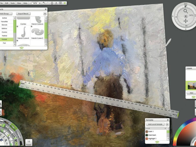 Um es vorwegzunehmen: So weit wie Painter geht ArtRage nicht, aber auch bei ArtRage hält die Farbe auf den Pinseln nicht ewig. Allen Versionen von ArtRage gemein ist die kreisförmige Werkzeugpalette links und die Farbauswahl auf der rechten Seite. Nur mit Grafiktablett lässt sich die Leistung des Programms ausnutzen, die etwas eigenwillige Benutzeroberfläche lässt sich mit ihren großen Schaltflächen gut mit Stift bedienen.