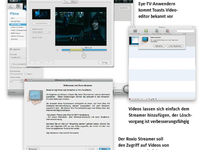 Mit Versionsnummer neun ist Roxios Toast mehr denn je auf dem Weg weg von einem Brennprogramm hin zu einer Multimedia-Schnittstelle. Im Look-and-Feel einiger dieser neuen Funktionen fällt dabei besonders die Verwandtschaft zur TV-Software EyeTV ins Auge. So verfügt Toast 9 jetzt auch über einen Schnitteditor, um Videomaterial noch direkt im Brennprogramm zu bearbeiten. Die Handhabung der Funktion zur Videobearbeitung ist dabei wie von EyeTV gewohnt.