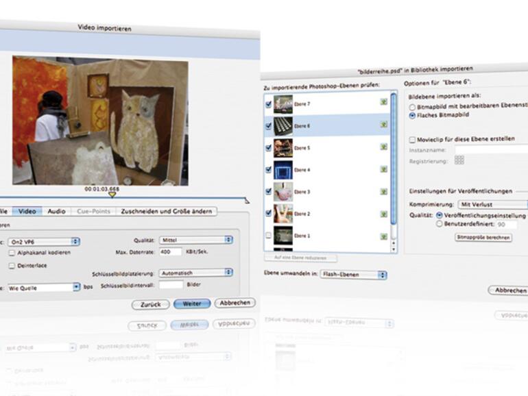 Die Fusion von Macromedia und Adobe hat sich auf den Photoshop-Import positiv ausgewirkt. Wird eine Photoshop- oder Illustrator-Datei importiert, öffnet sich ein Dialog, in dem für jede Ebene festgelegt werden kann, ob sie importiert werden soll. Alle Ebenen werden in eine Flash-Ebene oder in Schlüsselbilder umgewandelt, es ist also möglich, in Photoshop eine Animation vorzubereiten und dann in Flash zu übernehmen.