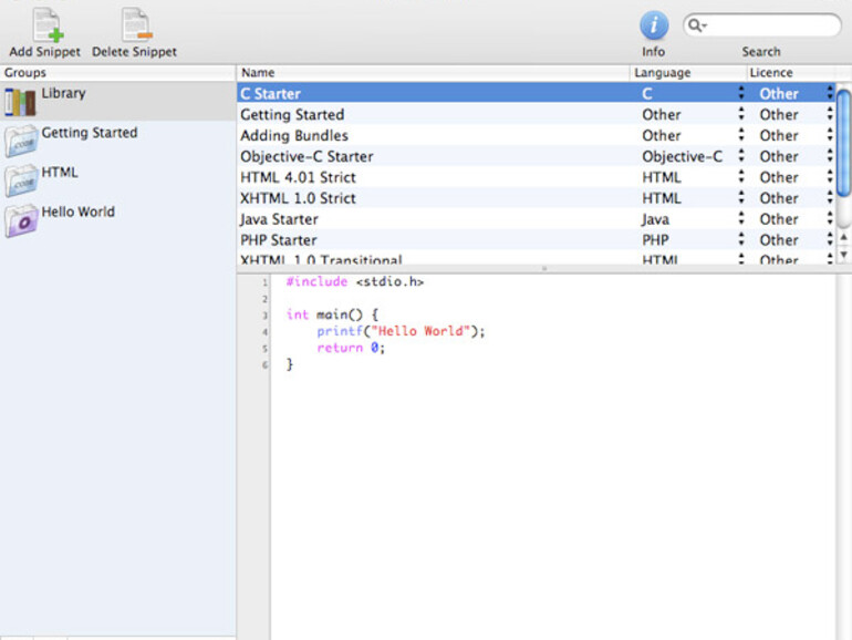 Sinnvoll ist auch die Lizenz (BSD, MIT, GPL, GPL2, LGPL, Apache), welche gleich neben der Sprachwahl angegeben wird. Als moderne Datenbank verfügt es natürlich über eine Live-Suche sowie intelligente Ordner. Code Collector ist mit den Bundles von TextMate kompatibel und kann so um die Unterstützung von mehr als 30 Programmiersprachen erweitert werden.
