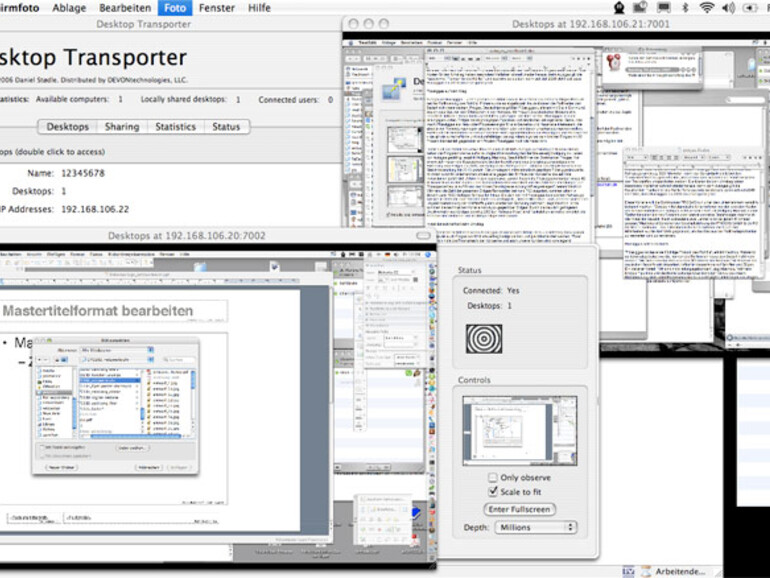 Die fernen Macs lassen sich über ein Symbol in der Menüleiste auf den Desktop holen. Dateitransfer per Drag-And-Drop zwischen ihnen ist nicht möglich. Desktop Transport lässt sich über das Terminal auch als Unix-Daemon bedienen. Kleines Schmankerl: Auch nach einem Anwenderwechsel bleibt der Schreibtisch des nicht aktiven Anwenders für Desktop Transporter erreichbar, so dass man mit mehreren Anwendern gleichzeitig an einem Rechner arbeiten kann: einer „vor Ort“ und die anderen über den Zugriff per Desktop Transporter von einem anderen Mac aus.
