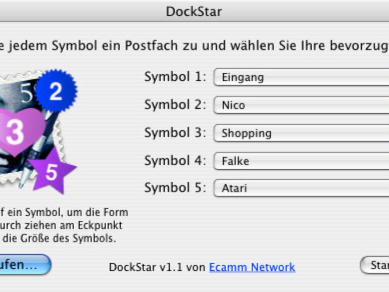 Nach der Installation erhält Mail in den Einstellungen eine neue Seite für DockStar, dort wird auch festgelegt, welches Postfach oder welchen Ordner die Erweiterung überwachen soll. Dank der Apple-Farbauswahl gibt es bei der Farbwahl keine Einschränkungen, auch die Transparenz kann variiert werden. Ein netter Gag, der bei der Zuordnung zusätzlich hilft, sind unterschiedliche Formen: Wer verdächtig viele Liebesbriefe erhält, schickt diese über eine Regel in ein eigenes Postfach, lässt es von DockStar überwachen und durch ein Herzchen im Dock symbolisieren.
