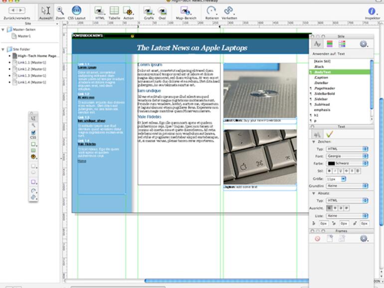 Bislang war es notwendig, Titelzeilen oder Logos, die spezielle Schriftzüge benötigen, in einem Grafikprogramm zu erstellen und als Grafik abzuspeichern. Das dient bei Firmen zumeist einem einheitlichen Erscheinungsbild. Bestes Beispiel dafür ist Apple. Auf der Homepage wurden alle Zeilen, die die bevorzugte Schrift verwenden, als Grafik eingebunden. Freeway 4 beherrscht das jetzt autonom, der Umweg über ein Grafikprogramm wird damit überflüssig. Mit einem einzigen Klick wird ein Text in eine Grafik umgewandelt. Das geht für vollständige Textobjekte, doch auch einzelne Absätze und Buchstaben können in Grafiktext verwandelt werden. Das Beste daran ist, dass der Text nach wie vor voll editierbar ist. Sämtliche Stilfunktionen können nach diesem Vorgang darauf angewendet werden, aber auch der Text selbst kann immer noch verändert werden. Gegenüber der eingangs angesprochenen Arbeit mit einem Grafikprogramm bedeutet das natürlich eine große Arbeits- und Zeitersparnis.