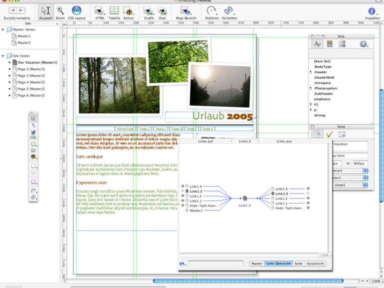 Das preisgünstigere Freeway Express verfügt über einen ähnlichen Umfang an grundlegenden Funktionen wie Freeway Pro. CSS und XHTML werden aber nicht unterstützt, ebenso bleibt der Import von Photoshop- und TIFF-Dokumenten der Pro-Version vorbehalten. Einige Layout-Funktionen, wie prozentuales Positionieren und weitere Funktionen, die eher das Interesse fortgeschrittener Anwender auf sich ziehen, sucht man ebenfalls vergebens. Manche Funktionen sind in Express sogar komfortabler zu bedienen, wie in Freeway Pro. So lässt sich der Rahmen um Objekte mit einem Klick auf eine Voreinstellung schnell und bequem ändern. Einsteigern sei die abgespeckte Version also wärmstens empfohlen!
