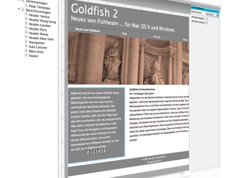 Äußerlich hat sich am neuen Goldfish wenig geändert. Die einst freischwebende Werkzeugleiste hat ihre neue Position unterhalb der Menüleiste gefunden. Wer jedoch nach altem Schema eine Webseite kreieren möchte, sieht sich der Frage nach dem Wie konfrontiert. Der neu programmierte Web-Editor unterteilt die Webseite in den Kopf, Fuß, die Navigation und Hauptseite. Hilfreich bei den ersten Schritten ist eine Online-Dokumentation, die auf der Internetseite von Fishbeam abrufbar ist und zurzeit nur in Englisch vorliegt.