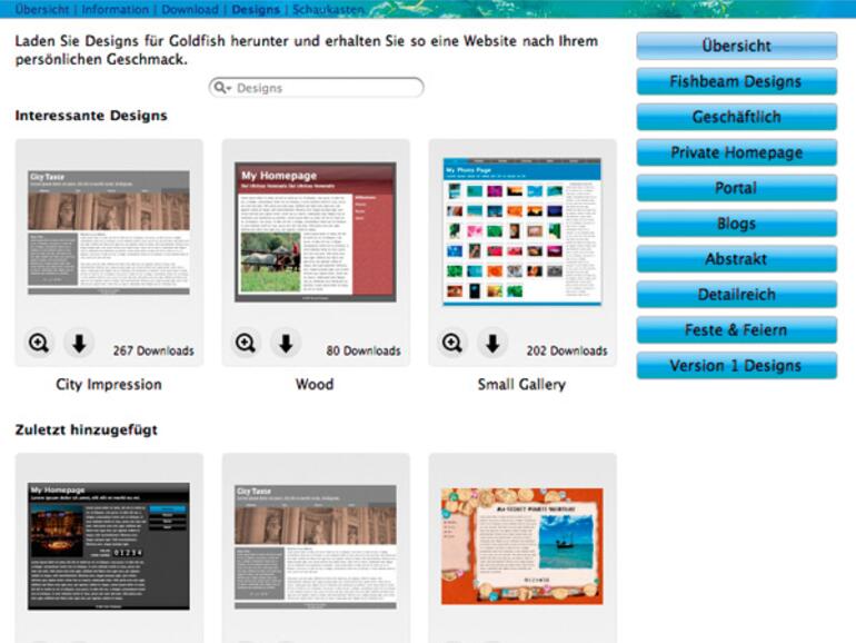 Neben den Vorlagen, die bereits mit der Installation auf die Festplatte gelangen, liegen weitere so genannte Designs kostenlos zum Herunterladen bereit. Ohne zusätzliche Hilfe einer externen Applikation veröffentlich Goldfish 2 den Inhalt der selbst entworfenen Homepage. Dazu hat Fishbeam seinem Spross einen eigenen FTP-Client spendiert. Sie benötigen lediglich die Zugangsdaten Ihres Providers, um alle Daten auf dessen Server hochzuladen.