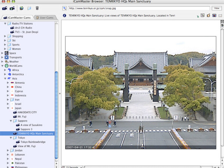 Nach dem Start zeigt sich ein etwas altmodisch wirkendes Programm, welches ähnlich wie ein Web-Browser aufgebaut ist. Am oberen Fensterrand steht daher die Adresse der Webcam und links Symbole für die diversen Programmfunktionen. Die Webcams sind in einer Liste auf der linken Seite untergebracht und so fein in diverse Kategorien (Natur, Museen) einsortiert, dass pro Kategorie meist nicht mehr als fünf Kameras zur Auswahl stehen. Das fällt zum Beispiel bei Städten wie London auf – mit lediglich zwei Kameras ist die Metropole etwas unterrepräsentiert. Weitere Kameras können hinzugefügt werden und sind dann im Bereich „User Cams“ sichtbar. Außerdem ist es möglich, diese hinzugefügten Kameras an den iCamMaster-Hersteller zu schicken, wovon dann schließlich alle Anwender profitieren.