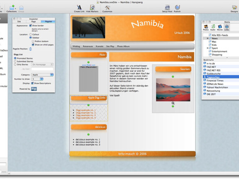 Ähnlich, wie RapidWeaver und iWeb bietet Sandvox vorgefertigte Designs für die Website. Mit einfachen Befehlen lassen sich einzelne Seiten hinzufügen, für die unterschiedliche Vorlagen zur Verfügung stehen. So weit kennen wir das ja alles schon von der Konkurrenz. Verblüffend ist aber, dass Seitenvorlagen für Weblogs oder Fotoalben fehlen, schließlich ist Bloggen und Photocasten momentan absolut hip! Sandvox bietet dafür so genannte Collections an, die wiederum beliebige Seiten aufnehmen können. Zusätzlich sind Pagelets vorhanden, kleine Platzhalter, mit denen Fotos, Texte oder andere Inhalte auf einer Seite platziert werden können. Was sich kompliziert anhört, erweist sich nach einer kurzen Einarbeitungsphase als sehr flexibles Konzept.