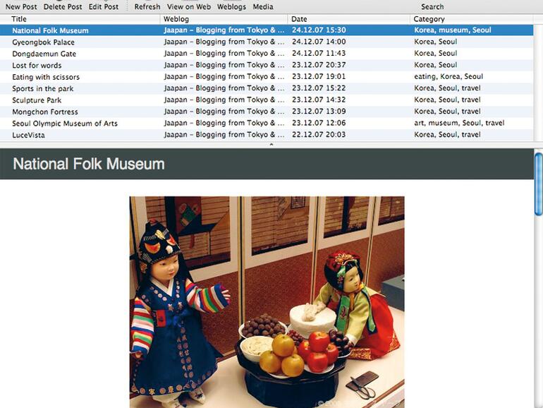 MarsEdit ist ein solcher Blogeditor, an denen auf dem Mac kein Mangel herrscht. Nach dem Start fragt das Programm, ob ein neues Blog eröffnet oder ein bestehendes genutzt werden soll. Letztere Funktion lädt nach Eingabe der Adresse, Benutzernamen und Passwort die Liste der bestehenden Blog-Einträge mit dem Dateidatum und den zugewiesenen Kategorien. Getestet wurde MarsEdit mit einem Wordpress-Blog, aber es unterstützt auch Blogger, Drupal, LiveJournal, Movable Type, Vox und alle, die zu Blogger, MetaWeblog, Blosxom kompatibel sind. Das Bearbeiten von Einträgen kann entweder im internen oder einem externen Editor geschehen.