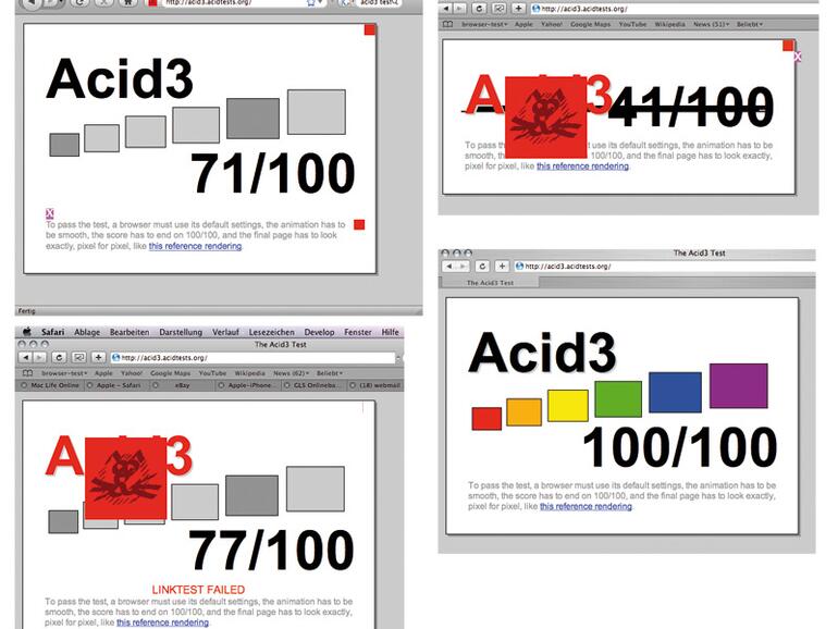 All das zeigt, dass Safari weiterhin auf einem guten Weg ist, Maßstäbe bei CSS3-Umsetzung und weiteren Innovationen zu setzen. So auch beim berüchtigten Acid3-Test, den Safari mit 77 von 100 Punkten abschließt. Der große Vorreiter WebKit, den eine Entwicklergemeinschaft als OpenSource vorantreibt, ist inzwischen bei 100 Prozent angelangt. In WebKit steckt die Rendering-Engine, die neben Safari auch iCab-, Shiira und viele weitere sogenannte WebKit-Browser versorgt. Mit den neuen Errungenschaften, den Nightly Builds, wird allerdings nur der WebKit-Betabrowser aktualisiert.