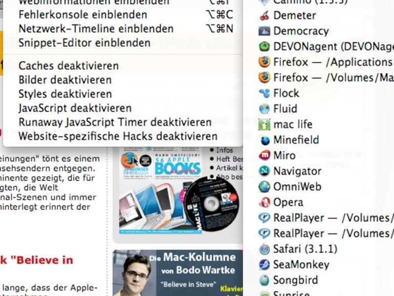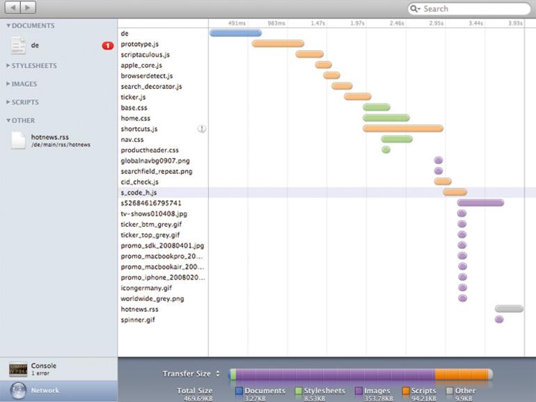 Die „Webinformationen“ mit detailliertem Ladeprotokoll und Zeitmessung („Netzwerk-Timeline“) können im separaten Fenster mitlaufen, oder am unteren Rand des Browserfensters eingeblendet werden – praktisch, wenn man sehen will, wo eine Seite hakt oder was so alles nachgeladen wird, je länger man auf manchen Seiten ist. Des weiteren lassen sich Caches, Bilder, Style Sheets und Javascripte deaktivieren. Das reicht schon, um an Firefox Firebug-Erweiterung heran zu kommen. In der Symbolleiste ergänzt nun ein kleines Schneiderlein die Funktionen. Damit werden Web-Clips als Dashboard-Widgets aus einer aktiven Website ausgeschnitten und geladen. Die Widgets zeigen im Dashboard live-aktualisierte Website-Ausschnitte – Apple hat hier freie Technologie in den Browser integriert.