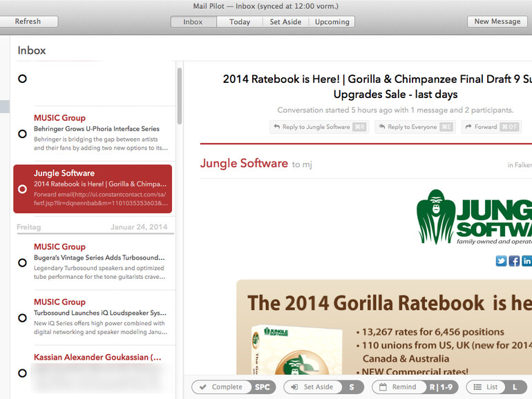 Nach der Einrichtung der gewünschten IMAP-Konten trudeln auch schon die ersten Mails in das Mail-Pilot-Fenster ein. Der Aufbau des Fensters erinnert an Apple Mail, allerdings sind in der Seitenleiste andere Optionen als gewohnt vorhanden. Neben dem Posteingang, der alle IMAP-Konten zusammenfasst, sind das die Erinnerungen, nächste Termine und die Ablage. Der Posteingang erinnert dann stark an eine To-Do-Liste, Mails lassen sich per Tastendruck oder Mausklick als abgearbeitet markieren und verschwinden dann aus dem Posteingang.