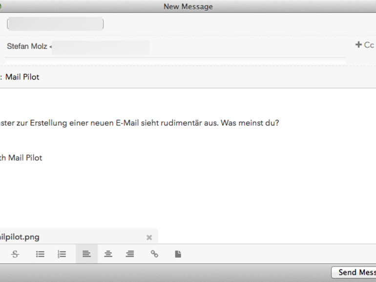 Die Entwickler von Mail Pilot haben sich ganz auf das Konzept eines Mail-Clients als To-Do-Liste konzentriert. Andere sonst übliche Funktionen wurden vernachlässigt und die Anwendung macht einen eher rudimentären Eindruck. So wirkt das Fenster zur Eingabe einer neuen Mail so, als sei es in wenigen Minuten schnell zusammengeklickt worden. Anders als Apple Mail kann Mail Pilot nicht anzeigen, wie viel Speicherplatz genutzt wurde.