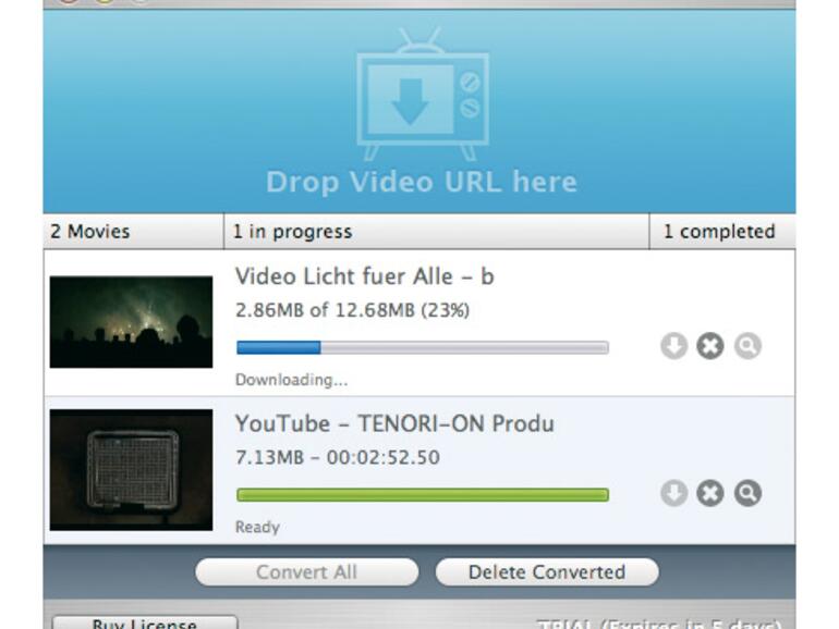 Die Benutzung der Anwendung ist fast so einfach wie die des Plug-ins: Die Webseite muss durch Klick auf das Symbol neben der Webadresse auf das Fenster der Videobox gezogen werden. Anschließend wird der Inhalt kurz analysiert und der Download kann gestartet werden. Es ist auch möglich, zunächst einige Videos zu sammeln und sie dann zusammen herunterzuladen. Zum Abschluss konvertiert Videobox die Flash-Videos in das iPod- und iPhone-kompatible QuickTime-Format. Qualitätseinstellungen oder andere Einflussmöglichkeiten auf die Konvertierung gibt es nicht.