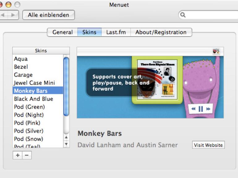 Menuet ist in erster Linie eine iTunes-Wiedergabesteuerung. Nach der Installation richtet es sich in der Menüzeile ein, mit einem Klick erscheint die an die Menüzeile gebundene Steuerung. Diese gibt es in verschiedenen Varianten, Nachschub steht auf der Menuet-Website zur Verfügung. Neben der Menüleiste verewigt sich Menuet auch in den Systemeinstellungen: Dort werden beispielsweise die Tastaturkürzel zum Vor-/Zurückspulen bestimmt. Wer beim Social-Music-Dienst Last.fm registriert ist, kann Menuet sogar dazu benutzen, Freunde mit ähnlichem Musikgeschmack zu finden.