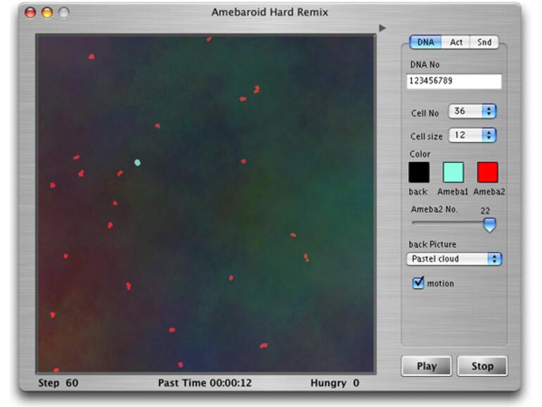Nie um ausgefallene Möglichkeiten verlegen, Töne zu erzeugen, hat Kazuto Ohsima mit Amebaroid eine eigenwillige Mischung aus „Game of Life“ und einem experimentellen Musikprogramm erstellt. Hauptakteure sind dabei bis zu 22 Amöben, die mehr oder weniger munter auf dem Spielfeld herumwandern und dabei Töne auslösen. Letztere rekrutieren sich aus dem QuickTime-Instrumentenangebot, welche davon gewählt werden dürfen, kann in den Optionen bestimmt werden. Neben den Instrumenten sind Parameter wie Geschwindigkeit, Richtung, DNA und Hintergrund wählbar.