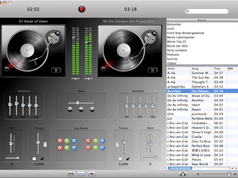 Zu letzterer Kategorie zählt djay, ein Audioprogramm, welches zwei virtuelle Plattenspieler bietet und die iTunes-Bibliothek als billigen Plattenlieferanten nutzt. Ausgenommen sind davon Songs, die im iTunes Music Store gekauft wurden. Während sich die beiden Plattenteller drehen, kann im Mixer-Bereich per Maus gemischt werden – sinnvoller ist es jedoch die Tastaturkürzel zu benutzen. Der Crossfader sorgt für einen automatischen Übergang, in den Einstellungen kann zwischen drei verschiedenen Kurven gewählt werden.