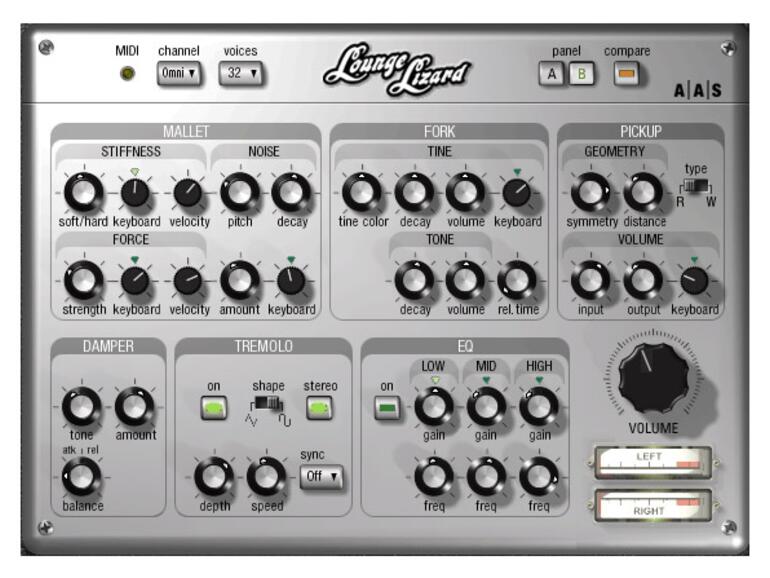 Im Unterschied zu Sample-basierenden E-Piano-Simulationen beruht das Prinzip des Physical Modeling auf der Nachbildung der Tonerzeugung des elektrischen Fender-Rhodes-Klaviers. Ein Hammer trifft auf eine Metallplatte und versetzt diese in Schwingungen, die ähnlich wie bei einer E-Gitarre mit einem Tonabnehmer elektromagnetisch gewandelt werden. All diese Elemente sind im Lounge Lizard EP in ein Rechnermodell gepackt, mit einem überschaubaren Interface versehen und können verändert werden. Nicht der statische Klang wird reproduziert, wie dies beim Sampling der Fall ist, sondern jeder Ton wird neu berechnet. Dadurch werden sehr filigrane Sounds möglich, die über viel Dynamik verfügen. Durch die Editierbarkeit der Klangparameter sind auch recht vielfältige Klangmanipulationen möglich, die weit über die bekannten E-Piano-Spielarten hinausgehen. Da mutiert das eher ausgelutschte Arbeitstier elektrisches Klavier mit wenigen Mausklicks oder Controller-Bewegungen zum Phoenix der Soundgestaltung.