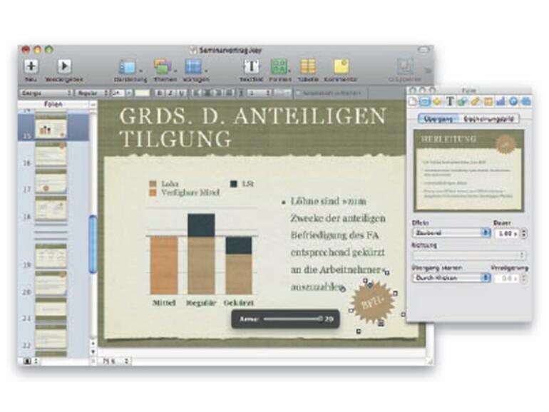 Auch in der Text- und Layout-Applikation Pages haben sich in Version ’09 vor allem Details geändert. Augenfälligste Neuerung: 40 neue Vorlagen für zusätzliche Plakate, Broschüren und Briefe – Appletypisch in guter Qualität. Etwas versteckter ist da schon der Vollbildmodus, der das Dokument in Einzel- oder Doppelseitenansicht auf Bildschirmgröße skaliert und den Monitor rechts und links daneben verdunkelt. Auf Funktionalität muss dennoch niemand verzichten: Das Menü samt aller Befehle erscheint an gewohnter Stelle, sobald der Mauszeiger den oberen Bildschirmrand berührt, die Seiten-Spalte bleibt linkerhand verfügbar. Selbst das Informationen- und weitere Fenster können geöffnet werden. Einzig, dass am unteren Bildrand nur ein Wort-, aber kein Zeichenzähler zu fi nden ist, stört in der Mac-Life-Redaktion.