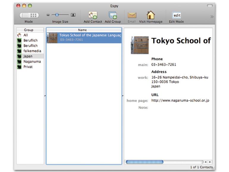 Die Möglichkeiten zur Bearbeitung entsprechen denen vom Adressbuch, nur sind sie teilweise anders aufgebaut oder an anderen Stellen untergebracht. Sinnvoll sind die beiden Darstellungsmodi von Espy natürlich nur dann, wenn möglichst viele Einträge mit einem (echten) Foto ausgestattet sind.