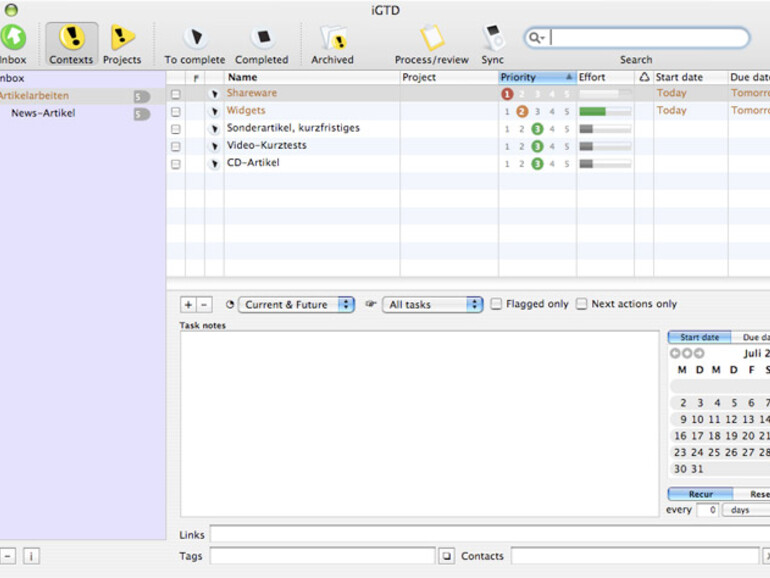 iGTD gehört noch zu den umfangreicheren Programmen mit der „Get Things Done“-Philosophie. Die Grundelemente sind natürlich vorhanden: Die Einteilung und Sortierung der Aufgaben in einen Kontext und in Projekte. Im dreigeteilten Fenster zeigt die Anwendung eine Gesamtübersicht und eine Liste der unter dem links gewählten Antrag vorhandenen Aufgaben an. Der untere Bereich gehört der Eingabe von Notizen und dem Kalender, mit dem das Start- und Fälligkeitsdatum gesetzt wird. Aufgaben, die demnächst fällig oder bereits überfällig sind, erscheinen farblich hervorgehoben, gleiches gilt für alle Aufgaben mit einer Priorität von 1 oder 2.