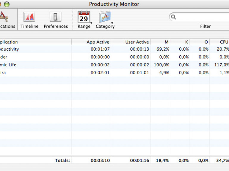 Viel einfacher ist da die Überwachung der Computeraktivität, denn dies kann im Hintergrund und gerne auch unbemerkt geschehen. Arbeitgeber bedienen sich solcher Werkzeuge, um herauszufinden, ob Herr X ein besonderes Interesse an Websites der Kategorie Y hegt – dann droht Brief Z. Im Gegensatz zu diesen verdeckt operierenden Programmen bleibt Productivity gut sichtbar und ist somit nur für den persönlichen Gebrauch geeignet. Das Programm misst, wie viel Zeit in der obersten Anwendung verbracht wird, protokolliert die Häufigkeit von Tastendrücken und Mausbewegungen und zeigt die Ergebnisse als Liste an.
