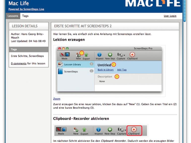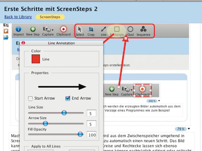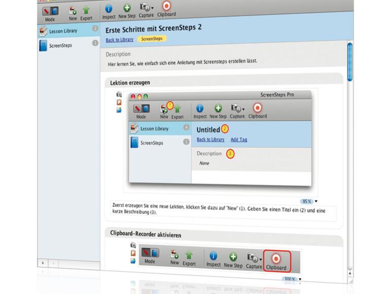 Der Arbeitsablauf ist sehr intuitiv gestaltet, ein Blick in die Bedienungsanleitung scheint überflüssig. Die erstellten Anleitungen, Lektionen genannt, werden in einer Bibliothek gesammelt. Zusammengehörende Lektionen lassen sich in Themen gruppieren. In einer neu erstellten Lektion wird mit der +-Taste ein Schritt erzeugt. Ein Bild kann mit ScreenSteps selbst aufgenommen werden, indem auf das Kamera-Symbol geklickt wird. Nach einer wählbaren Zeitspanne erscheint das Fadenkreuz, mit dem der Bildbereich bestimmt wird.