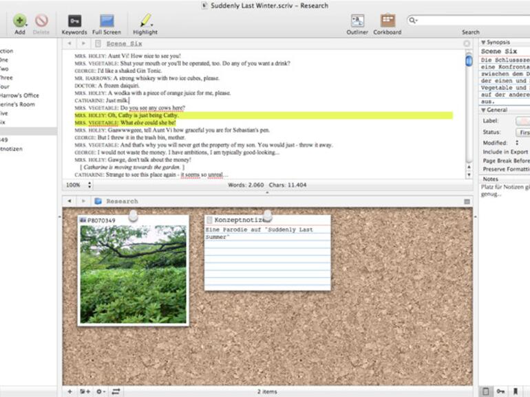 Scrivener ist weder puristisch veranlagt, noch hoch spezialisiert und richtet sich an alle, die in irgendeiner Form kreativ schreiben. Diese erwartet nach dem Start eine Projektverwaltung, welche in die Bereiche Vorlage (Draft) und Recherche aufgeteilt ist. Im Recherche-Bereich wird alles abgelegt, was für den Text irgendwie von Belang ist, sei es eine Notiz, Grafik oder PDF-Datei. Die Corkboard-Ansicht stellt diese wie Zettel auf einer Pinnwand dar; weniger hübsch, aber dafür informativer ist der Outliner, in welchem die Elemente in Textform aufgelistet werden.