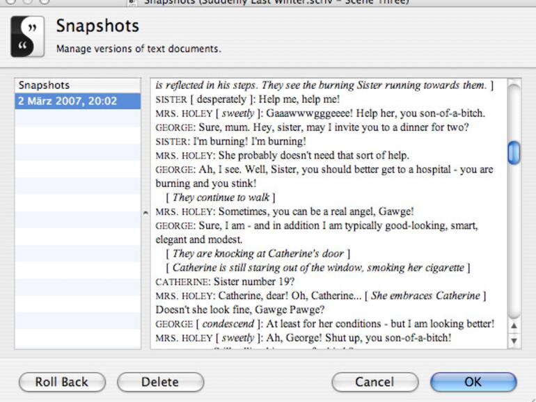 Wenn ein Kapitel komplett überarbeitet werden soll, empfiehlt sich eine Momentaufnahme mit der Snapshot-Funktion. Diese merkt sich den Text in seinem aktuellen Zustand und erlaubt jederzeit wieder zu diesem zurückzukehren oder auch nur Teile daraus zu kopieren, falls die Neufassung wider Erwarten doch nicht gelungen sein sollte. Als halbtransparentes Fenster zeigt sich die Liste der Schlüsselwörter: Sie werden von der Scrivener-Suchfunktion erfasst und stellen ein weiteres Instrument zur Kapitelbeschreibung dar. Das gewünschte Stichwort muss auf den entsprechenden Eintrag in der Projektliste (dem „Binder“) oder den Inspektor geschoben werden.