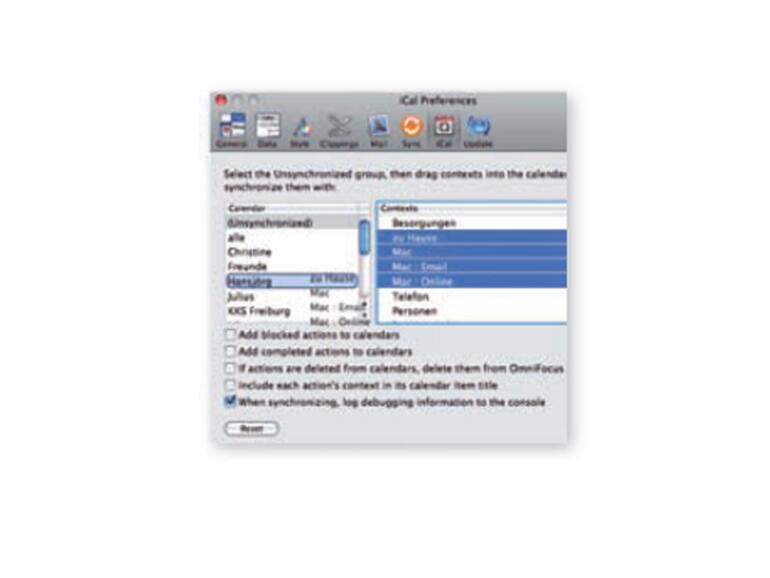 Die Anbindung an iCal und Mail wird in den Voreinstellungen definiert. So lässt sich jeder Kontextbegriff einem Kalender zuordnen. Bei der Synchronisation trägt OmniFocus in den entsprechenden iCal-Kalender die Actions als Aufgaben ein, ebenso überträgt iCal die vorhandenen Aufgaben in OmniFocus. Aus Mail lassen sich Nachrichten versenden, die durch den Zusatz +omnifocus per AppleScript übergeben werden. Durch den Einsatz von Sonderzeichen lässt sich die Nachricht so formatieren, dass Omni- Focus daraus das zugehörige Projekt, den Kontext, Start, Ende und Dauer ermitteln kann. Die Clipping-Shortcuts ermöglichen es, aus einem beliebigen Programm selektierten Text an Omni- Focus zu senden, wenn die Mac-OSX- Dienste von der Anwendung unterstützt werden.