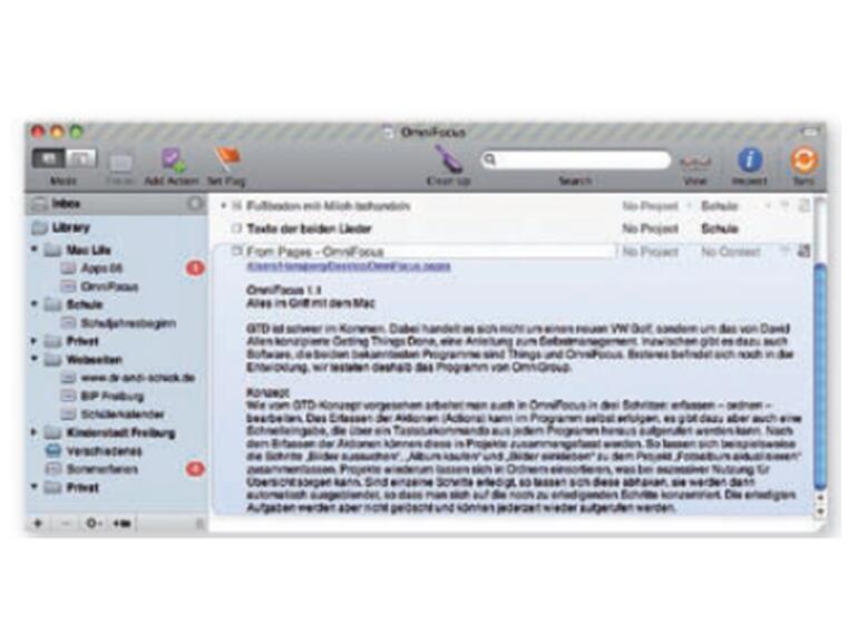 OmniFocus kann weit mehr als Listen verwalten, die Filter- und Kontextfunktionen ermöglichen ein zielorientiertes Abarbeiten der Aufgaben. Zwar ist anfangs etwas Überwindung notwendig, um das Programm kennen zu lernen – hinderlich ist dabei die fehlende Lokalisierung –, anschließend macht es aber richtig Spaß zu sehen, was man an einem Tag alles erledigt bekommt, wenn die Aufgaben gut strukturiert wurden.