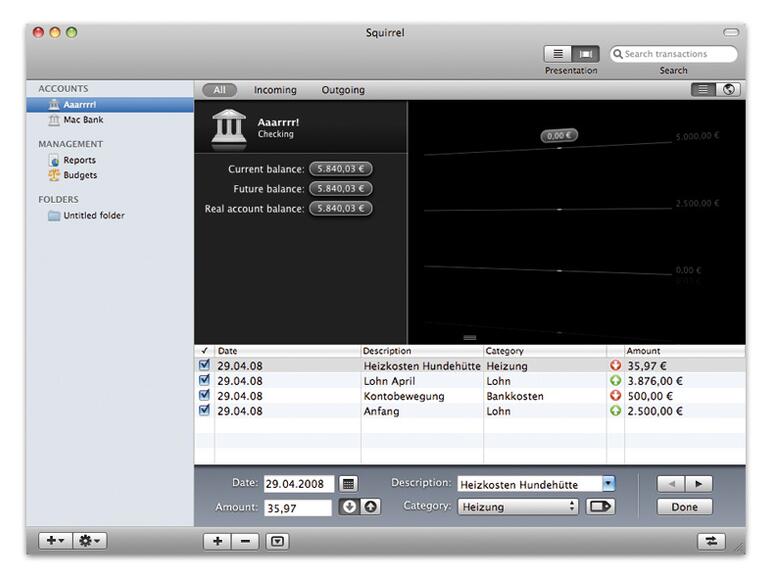 Zwar kennt Squirrel monatliche Budgets und kann sie auch visuell darstellen, aber regelmäßige Zahlungsein- und -ausgänge lassen sich nicht automatisieren. Sinnvoll wäre es auch, wenn der aktuelle Kontostand in der Seitenleiste stünde. Dafür lassen sich Kontobewegungen mit Stichwörtern versehen, die wiederum von intelligenten Ordnern aufgegriffen werden können. Den Trend aktueller Finanzverwaltungen (MoneyWell, Cha-ching), auch etwas für das Auge zu bieten, setzt Squirrel fort: Animierte Kuchendiagramme, bei denen die Kuchenstücke durch Auswählen mit dem Mauszeiger „herausfahren“ – Squirrel bietet dank Leopard flüssigere Animationen als so manches Spiel.