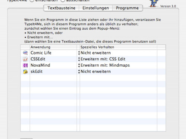 TypeIt4Me ist jetzt ein Universal-Binary-Programm, es arbeitet also problemlos auch auf Intel-Macs. Das Kontrollfeld wurde vollständig neu in Cocoa geschrieben, ist übersichtlicher geworden und dadurch einfacher zu bedienen. Die Textbausteine lassen sich in einer übersichtlichen Liste ausdrucken. Jetzt kann auch festgelegt werden, wo sich der Cursor nach dem Einfügen des Textbausteines befinden soll. Die Limitierung von 2700 Textbausteinen pro Datei wurde aufgehoben. Ein Anreiz, von einem ähnlichen Programm zu TypeIt4Me zu wechseln, gibt es auch: Wer von TextExpander oder Typinator umsteigen möchte, kann seine Makros in TypeIt4Me importieren.