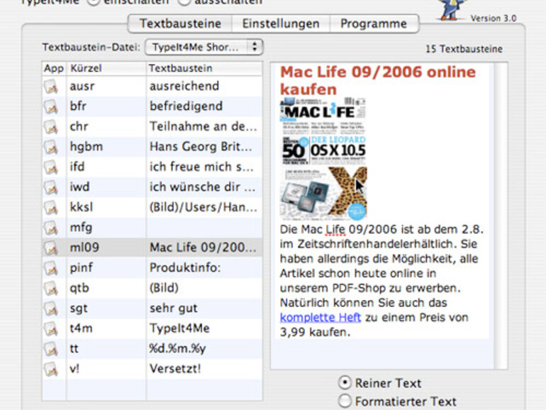 Wohl wichtigste Neuerung ist die Unterstützung des RTFD-Formats. Dadurch lassen sich Textformatierungen vollständig erhalten. Darüber hinaus lassen sich sogar Bilder per Trigger in ein Dokument einfügen. Eine Möglichkeit wäre das Einsetzen des Firmenlogos. Das funktionierte in den meisten Applikationen völlig problemlos. Allerdings sind viele Office-Programme noch nicht RTFD-kompatibel. RagTime und Word waren nicht in der Lage, die Bilder einzusetzen, wenn sich in dem Textbaustein Text und ein Bild befanden. Diese Problem lässt sich momentan nur umgehen, indem für jedes Bild ein eigener Textbaustein verwendet wird.