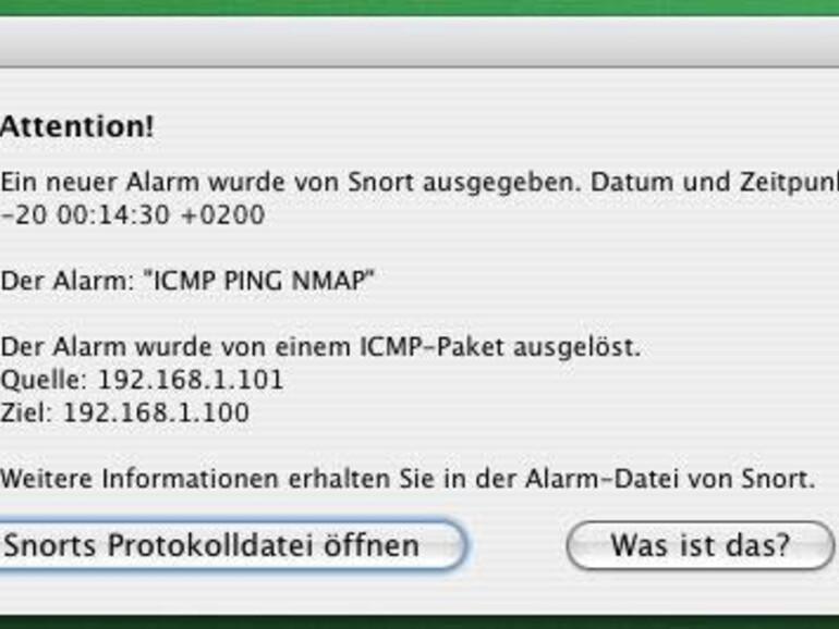 Wenn nun Rechner hamlet, die Linux-Maschine, einen Portscan gegen den Mac durchführt, passiert folgendes: HenWen registriert den Portscan und LetterStick generiert umgehend eine Alarmmeldung (Alert), d. h. ein Pop-up-Fenster erscheint auf dem Desktop und informiert über diesen Umstand. Damit das Beispiel funktioniert, muss im HenWen-Main-Tab Alarm das Kästchen Netzwerkscanning (Port-Scanning, Netzwerkmapping, usw.) aktiviert sein. Noch genauere Informationen liefert die Snort-Protokolldatei; klicken Sie wiederum auf den LetterStick-Menüpunkt Snorts Protokoll-Datei öffnen … Sie sehen dann auf der Konsole weitere Informationen.
