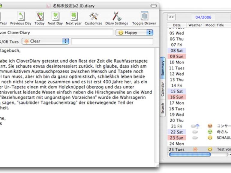 CloverDiary erinnert auf Wunsch daran, dass wieder einmal ein Eintrag fällig ist – diese Erinnerung fällt aber so dezent aus wie der Ton eines eingeschüchterten Weckers. Das Eingabefeld des Tagebuchs besitzt die gleichen Fähigkeiten wie TextEdit, es lassen sich somit Farben, unterschiedliche Schriftarten und Grafiken einsetzen, auch wenn letzteres nicht offiziell unterstützt wird. Zu jedem Tag dürfen eine Stimmung in Form eines Smileys sowie die Wetterlage ausgewählt werden.