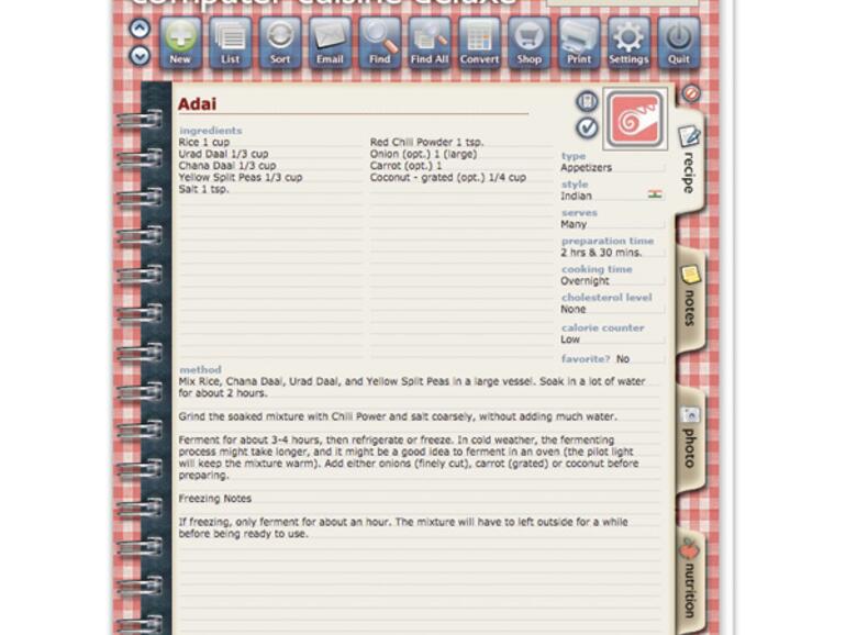 Bei 1000 Rezepten hilft die große Liste nicht viel weiter, daher gibt es verschiedene Wege, die Auswahl etwas einzuschränken. Landesspezifische Gerichte sind über die Stilliste schnell gefunden, wenn ein Fischgericht, eine Brotmahlzeit oder etwas Veganes auf den Tisch kommen soll, hilft die „Typ/Kategorie“-Liste. Für einige wenige Gerichte ist auch ein Foto vorhanden – vielleicht auch besser so, stellt ein solches Foto doch immer das Idealergebnis dar. Um zu vermeiden, dass der Kuchen zur Hälfte auf dem MacBook endet, kann man ein Rezept ausdrucken. Um besser abzuschätzen, ob ein Salatblatt mehr oder weniger für den täglichen Kalorienbedarf notwendig ist, gibt einen eingebauten Rechner.