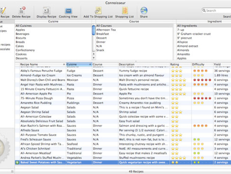 Connoisseur ist ein Software-Kochbuch und orientiert sich wie kaum ein anderes Programm seiner Art zuvor an iTunes – es fehlt eigentlich nur noch Cover Flow. Beim ersten Programmstart ist die Datenbank bereits gut mit diversen Gerichten gefüllt, vom Keks bis zu mexikanischen Spezialitäten. Neue Rezepte werden entweder abgetippt, von der Konkurrenz (MacGourmet, MasterCook, MealMaster, RecipeML, Yum!) importiert oder Websites entnommen. Bei einigen Websites ist es möglich, durch Markierung des Rezepts und Auswahl der Connoisseur-Importfunktion im Dienste-Menü, das Kochrezept unkompliziert zu importieren.
