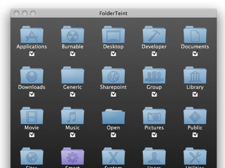 Auf eine etwas andere Weise nimmt sich FolderTeint dem Problem an: Während andere Programme das komplette Symbolset austauschen, nimmt diese Anwendung die Originalsymbole als Vorlage. Nach dem Start zeigt es dann auch die zwanzig Symbole an, die zu verändernden müssen mit einem Häkchen versehen werden. Da sich die Symbole in ihrer Farbgebung mit einer Ausnahme sehr ähneln und FolderTeint keine Funktion anbietet, ein Symbol gegen ein komplett anderes auszutauschen, spricht nichts gegen die Bearbeitung aller Icons auf einmal.