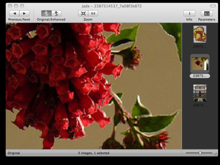 Jade ist kein Grafikprogramm wie Photoshop, sondern beschränkt sich auf die Bildkosmetik. Digitalfotos sollen mit dem Programm, besser aussehen und das mit möglichst wenig Eingreifen des Benutzers. Diese automatische Bildkorrektur schraubt an Helligkeit, Sättigung und Kontrast. Die Ergebnisse sind gemischt: Bei manchen Fotos wirkt die Korrektur übertrieben, bei anderen macht sie kaum einen Unterschied, während die dritte Gruppe durch die Bearbeitung deutlich gewinnt. Rein subjektiv sind die Ergebnisse der Farbkorrektur von Vorschau und der von Jade ähnlich, von der zusätzlichen Scharfzeichnung bei Jade abgesehen. Die Intensität der Korrektur lässt sich aber regulieren.
