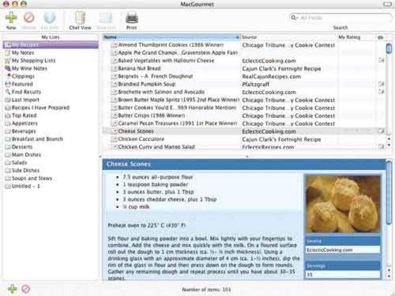 Der MacGourmet bietet beim ersten Programmstart den Import von Rezepten an. Von dieser Möglichkeit sollte Gebrauch gemacht werden, denn dann stehen gleich zu Beginn 100 Rezepte zur Verfügung. Der grundsätzliche Aufbau des Programms ähnelt iTunes und hält auf der linken Seite diverse Listen bereit. Diese Listen werden zum Teil automatisch (Rezepte mit guter Bewertung) oder manuell gefüllt.
