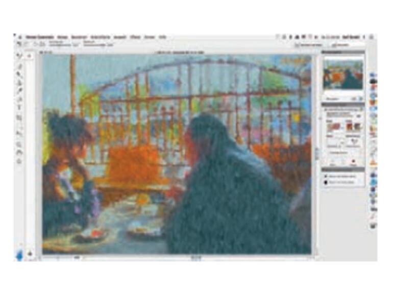 Das „Fotomalsystem“ ist in der neuen Ausgabe nicht nur als eigener Bereich, sondern als offenbarer niedrigschwelliger Einstieg in die digitale Malerei angelegt. Hier werden die schnellsten Malerfolge in Form von Gemälden aus Fotos sichtbar. Per Voreinstellung funktionieren alle Malwerkzeuge wie „Kloner“, das heißt, sie übernehmen die Farbe des Ursprungsbildes. Selbst mit dicken Borsten werden so sehr einfach überzeugende Ergebnisse erzielt. Über die neue Palette „Ursprungsbild“ wird der Klonursprung ausgewählt, eventuelles Pauspapier und dessen Deckkraft aktiviert und angepasst. Das Ursprungsbild wird mit dem entstehenden Gemälde gespeichert, so dass kein separates Foto geöffnet bleiben muss – in früheren Versionen musste man sich merken, welches Originalbild verwendet worden war. In der in PE 4 verbesserten Palette „automatisches Malen“ ist nun die Funktion „intelligente Striche“ enthalten, die für ein interaktives Pinselverhalten während des automatischen Malvorgangs sorgt. Anders als zum Beispiel bei Photoshop- Filtern folgt Painter mit seinen Pinselstrichen den Formen des Originalfotos. Pinselspitze, Strichlänge und Druck werden dynamisch den Details und Fokusbereichen angepasst. Allerdings kann diese Malweise auch seine Zeit dauern – am Bildschirm lässt sich wie im Zeitraffer jeder einzelne Strich des automatischen Malers verfolgen, je nachdem, welchen Untergrund und welchen Stil man für das Bild gewählt hat.