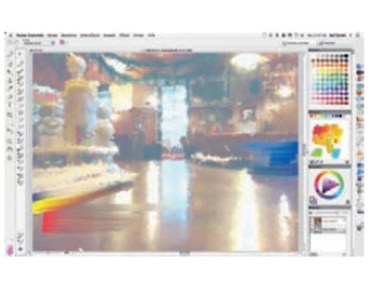 Corel hat festgestellt, dass für Essentials- Anwender offenbar zwei Arbeitsfelder besonders wichtig sind: Das Übermalen und Verarbeiten von Fotos und das klassische freie Malen und Zeichnen. Beide Bereiche sind jetzt per Karteikartenreiter bereits von der Oberfläche ab wählbar und enthalten die entsprechend benötigten und spezialisierten Werkzeuge. So enthält die „Zeichnen und Malen“-Oberfläche gleich die Paletten für Farben, das Farbrad und Ebenen. Neu darunter vertreten ist die „Mischer-Palette“, mit der im wahrsten Sinne des Wortes die Farbmischung auf der echten Malpalette des Künstlers imitiert wird. Im „Fotomalen“- Bereich finden die Anwender die Auswahlbox für das Originalfoto, die Möglichkeit zum „automatischen Malen“ nach Stil vorgabe und zwei Werkzeuge zum Wiederherstellen von Details. Die Auswahl der Fotovorlagen erfolgt jedoch leider blind: Das sich öffnende Finder-Fenster zeigt unter Mac OS X 10.4.x keine Vorschauen an, so dass die auszuwählende Datei mindestens dem Namen nach genau bekannt sein muss.